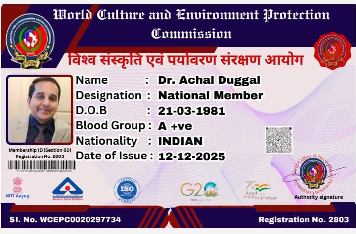 Identification card for Dr. Achal Duggal, serving as a National Member of the World Culture and Environment Protection Commission (WCEPC). The card features the organization’s logo, government-related emblems (NITI Aayog, G20), and a QR code for verification